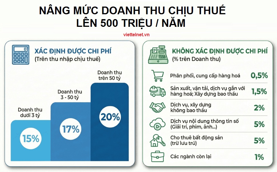 | Dưới 500 triệu | Miễn thuế | 0% | Không phải nộp thuế theo phương thức khoán, miễn VAT. |