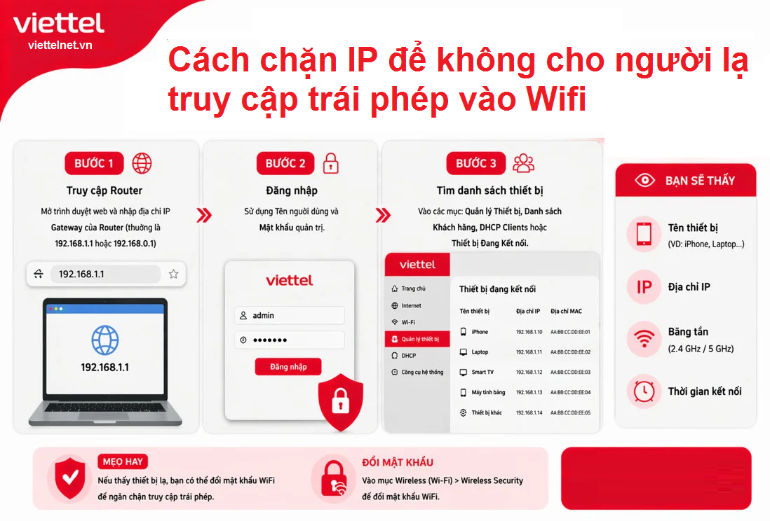Muốn chặn hiệu quả, bạn nên đăng nhập modem, kiểm tra danh sách thiết bị đang kết nối, xác định đúng IP rồi thêm vào mục chặn trong phần quản trị mạng. Đồng thời, nên kết hợp thêm các biện pháp như đổi mật khẩu mạnh, kiểm tra thiết bị lạ định kỳ và bảo mật tài khoản quản trị modem.