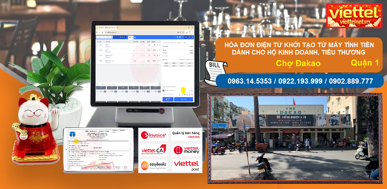 Hotline đăng ký triển khai Hóa đơn điện tử tận nơi, quý khách cung cấp địa chỉ và tên quầy hàng tại Chợ Đakao tới Hotline 0963.14.5353 / 0922.193.999 / 0902.889.777 để được Viettel gần nhất tới tận nơi lắp đặt