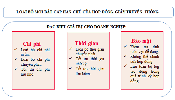 Về thời gian, hợp đồng điện tử giúp loại bỏ thời gian chuyển phát hồ sơ giữa các bên. Quy trình ký kết có thể được thực hiện trực tuyến nên thời gian chờ ký được tối ưu đáng kể. Việc tìm kiếm hợp đồng cũng trở nên nhanh chóng nhờ hệ thống tra cứu tự động.