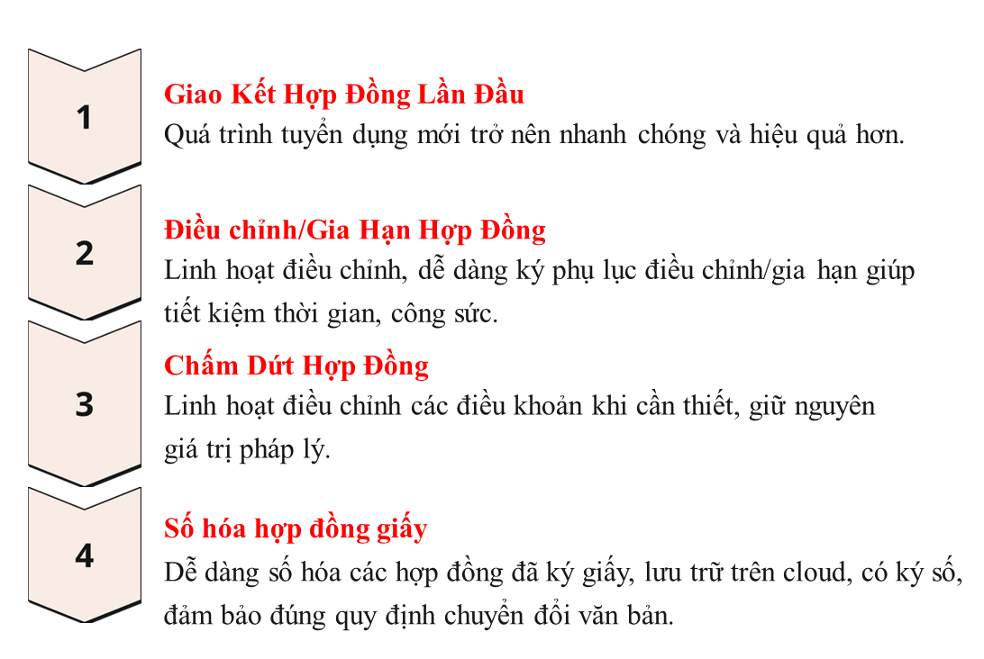 - Ngoài ra, hệ thống cho phép đăng ký chữ ký số và ký số trực tiếp trên link hợp đồng mà không cần cài đặt ứng dụng. Người lao động chỉ cần vài phút để hoàn tất việc ký hợp đồng điện tử.