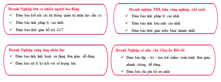 Giải pháp hợp đồng lao động điện tử Viettel đặc biệt phù hợp với nhiều loại hình doanh nghiệp. Các doanh nghiệp có số lượng lao động lớn như doanh nghiệp FDI, doanh nghiệp trong khu công nghiệp hoặc khu chế xuất có thể sử dụng hệ thống để xử lý việc ký kết hợp đồng với số lượng lớn. Các doanh nghiệp cung ứng nhân lực hoặc doanh nghiệp có nhu cầu chuyển đổi số trong quản trị nhân sự cũng có thể tận dụng giải pháp này để kết nối với các hệ thống quản trị nhân lực hiện có.