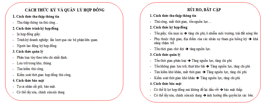 Về mặt bảo mật, nhiều hợp đồng được cá nhân tự lưu giữ hoặc cất giữ tại các kho lưu trữ nội bộ. Điều này khiến hợp đồng có nguy cơ bị chỉnh sửa, tẩy xóa hoặc thất lạc mà không có hệ thống kiểm soát rõ ràng.